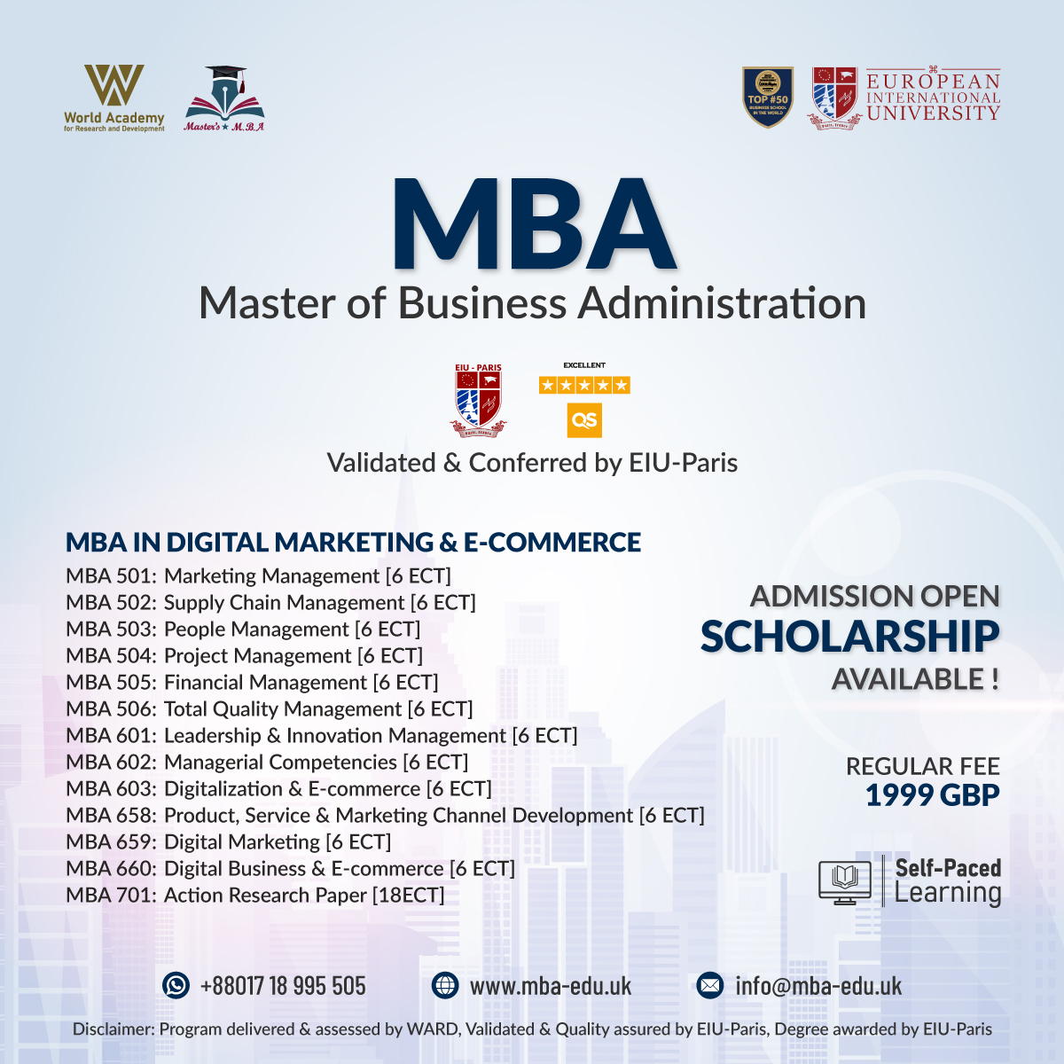 The Master of Business Administration (M.B.A.) program is designed to equip you with essential modern management knowledge, skills and tools to ensure your mindset, skill set and application ability for the business growth and sustainability.  MBA program accredited by European International University is one of the best in class in the global education. Our MBA Graduates are highly confident on the business management along with the subject matter socialization to contribute to the organization for its growth.