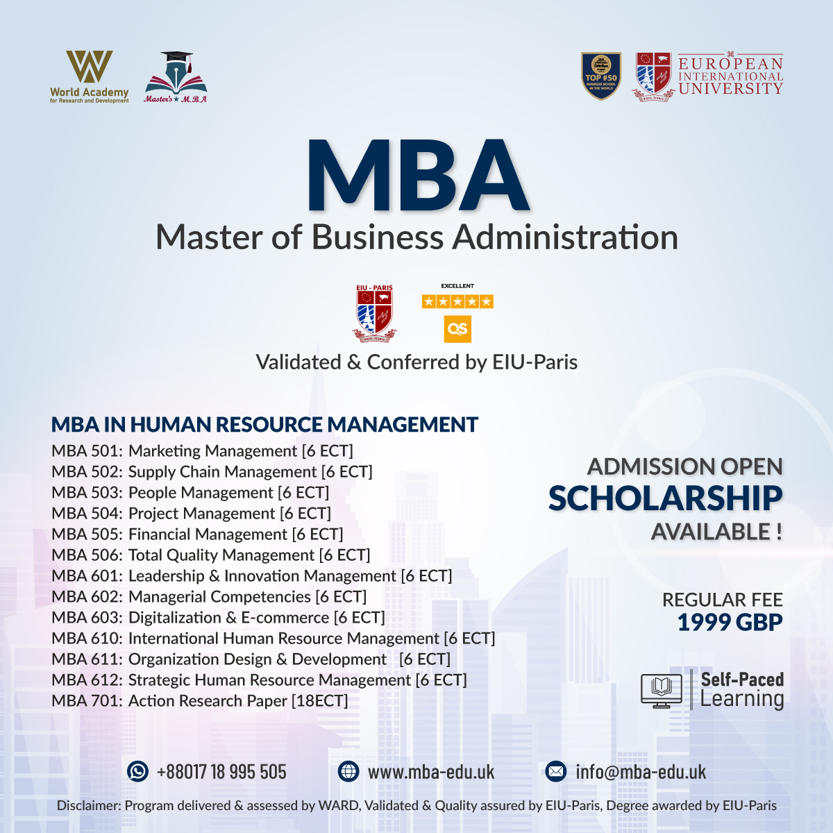 The Master of Business Administration (M.B.A.) program is designed to equip you with essential modern management knowledge, skills and tools to ensure your mindset, skill set and application ability for the business growth and sustainability.  MBA program accredited by European International University is one of the best in class in the global education. Our MBA Graduates are highly confident on the business management along with the subject matter socialization to contribute to the organization for its growth.