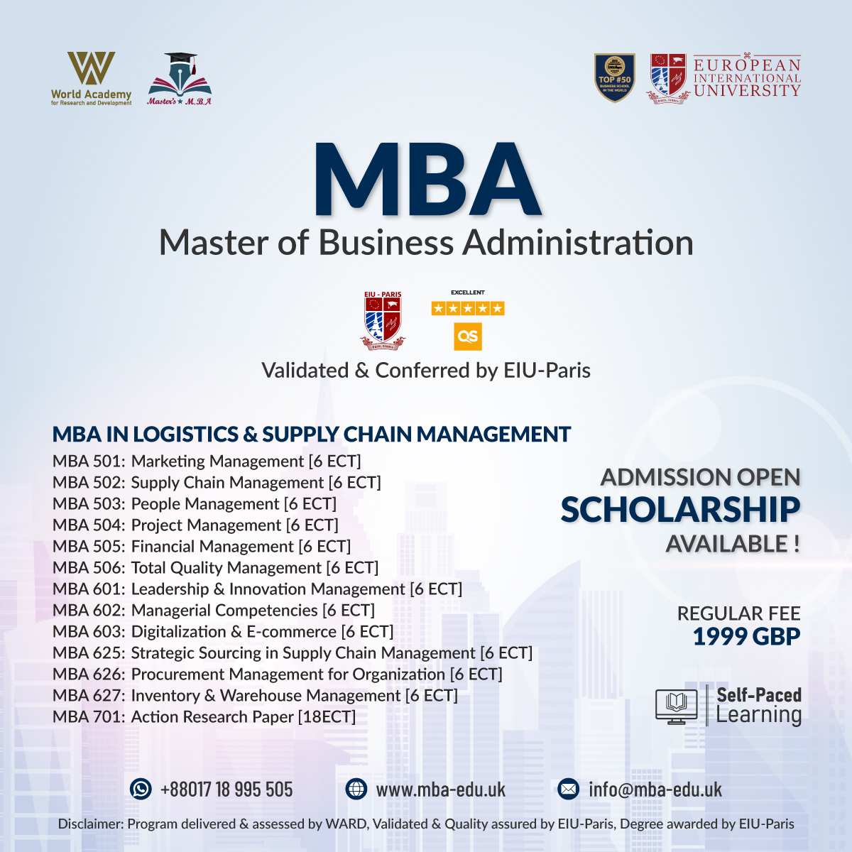 Program delivered & assessed by WARD. Validated, Quality Assured And Degree Awarded By EIU-PARIS