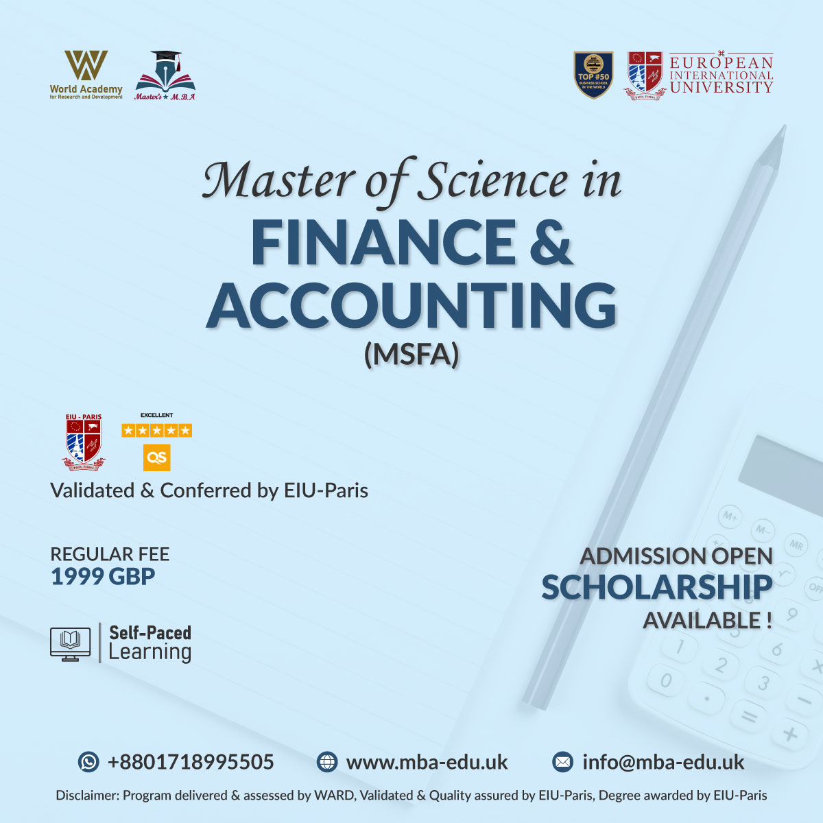 The Master of Science in Finance & Accounting is designed to provide students with a comprehensive understanding of the principles and practices in finance and accounting. This program integrates advanced theoretical knowledge with practical applications to prepare students for leadership roles in financial management, corporate finance, auditing, and strategic planning. Through a blend of coursework, research, and real-world experiences, students will develop the skills needed to navigate the complexities of the financial world.